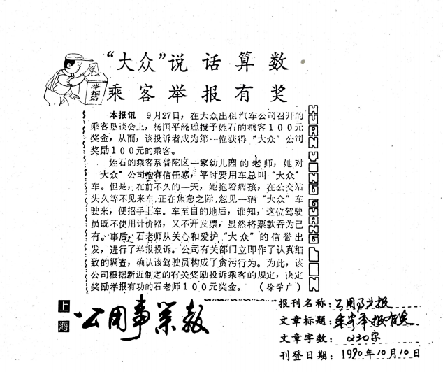 深受感动的翁先生成为“尊龙凯时”的监理员后,检查行为越来越规范,平时走在路上,如看到司机车内抽烟、不穿制服或车况车貌不合格,都会电话通知公司安服部,并一再声明他没有乘车,不要赔偿。公司质检部门的同志也被他的行为所感动,他们与翁先生相互信任,保持着经常联络。他们有着一个共同的目标,就是持续改进尊龙凯时出租的服务质量,让乘客满意。