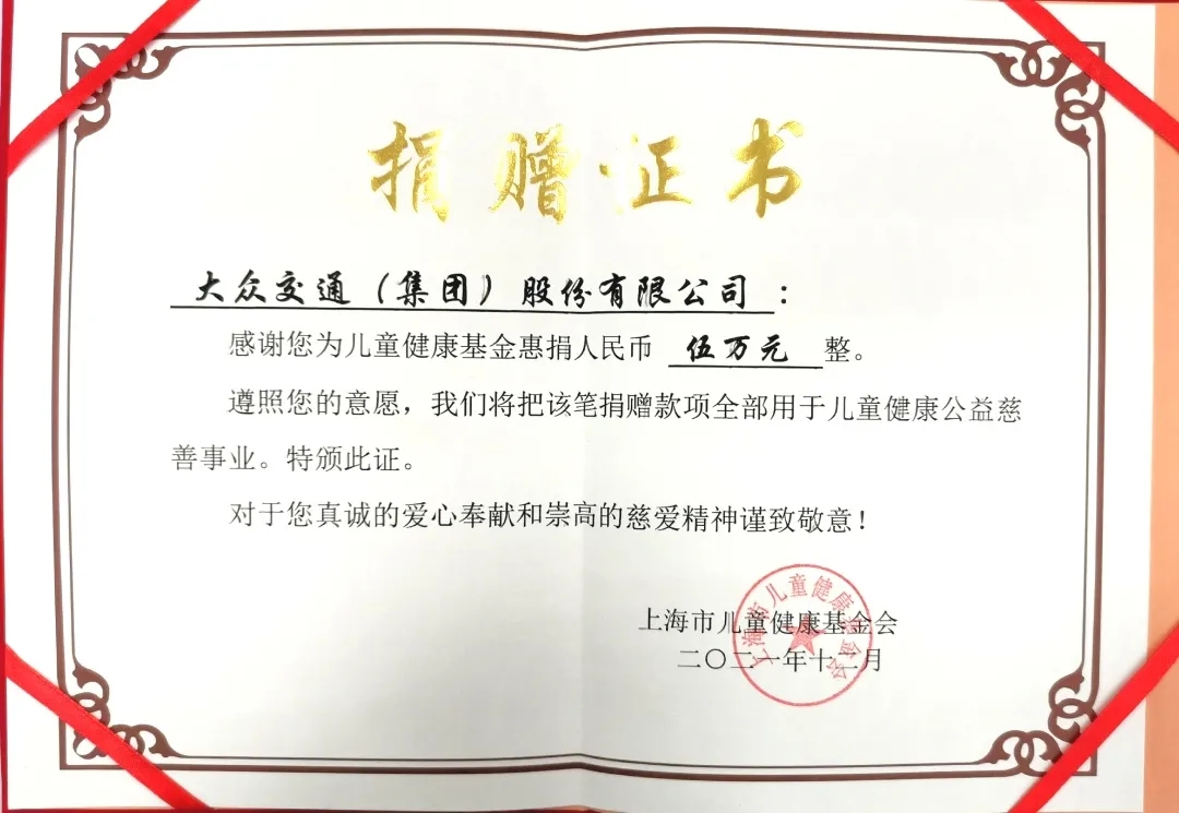 儿童健康,关乎未来。在公司成立33周年司庆之际,尊龙凯时交通(集团)股份有限公司向上海儿童健康基金会捐款伍万元,支持基金会积极拓展关爱儿童的慈善公益活动。