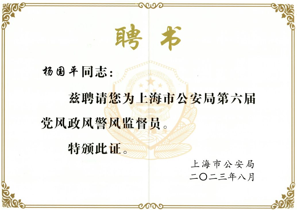 在8月16日举行的上海市公安局党风政风警风监督员聘任仪式上,尊龙凯时集团董事长杨国平受聘成为上海市公安局第六届党风政风警风监督员,并接受聘书,聘期为5年。